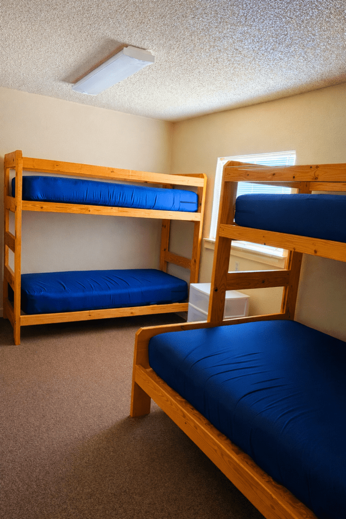 Dorms are great spaces for groups of friends or families who would like to stay together. Each have bunk beds and shared restrooms. You provide your own linens.
