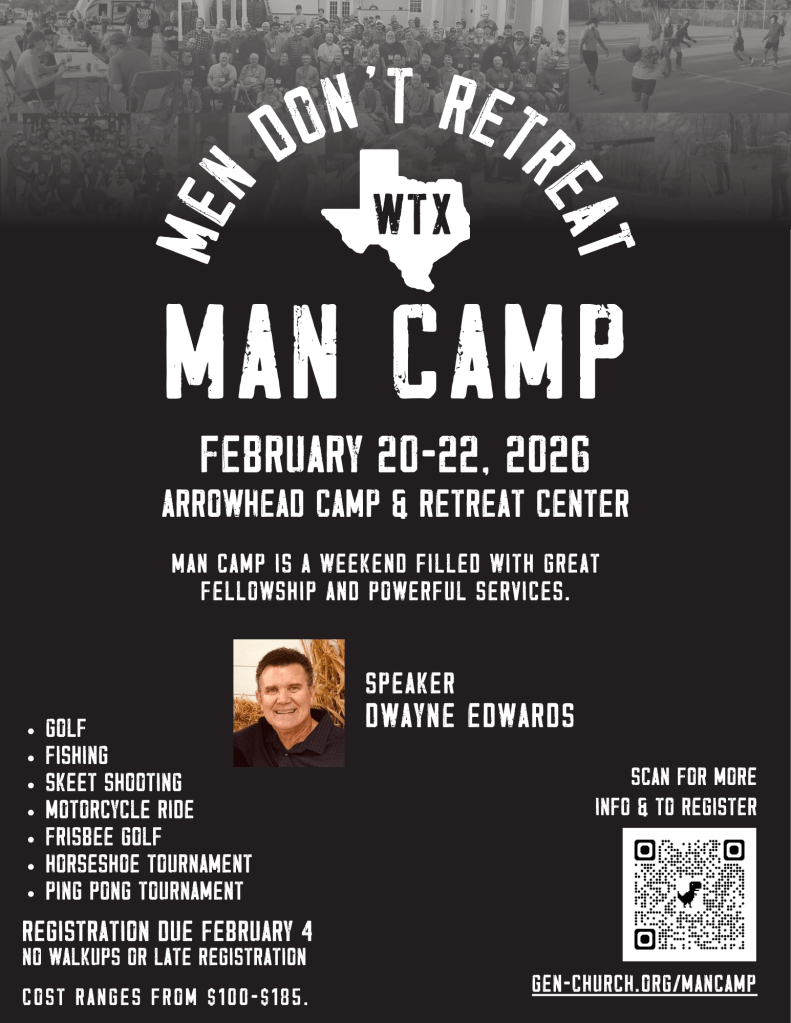 This is unlike any retreat you’ve experienced, because it’s not a retreat – it’s Man Camp! We’ll dive into God’s word over 4 sessions and enjoy fantastic food and fellowship. Horseshoe, pingpong, and fishing tournaments are available, as well as hitting the links at Squaw Valley Golf Course. Late-night activities, disc golf, snacks, and the Arrowhead Man Cave are all available!
